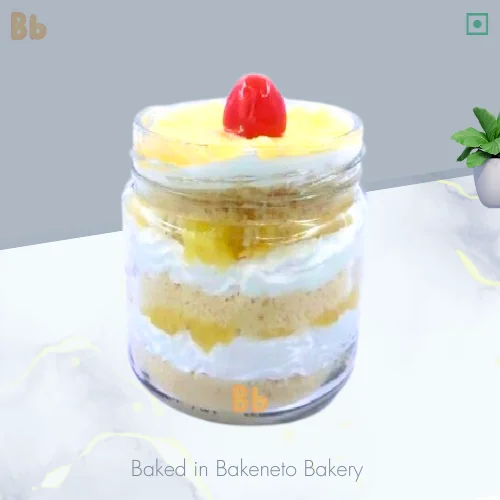 Tasty, evergreen and sweet combination of vanilla sponge with white butter cream and topped up with Red cherry & Pineapple slices filling in each layer. Get this Pineapple Jar cake in just less then 60 minutes in Noida with Free Delivery option.